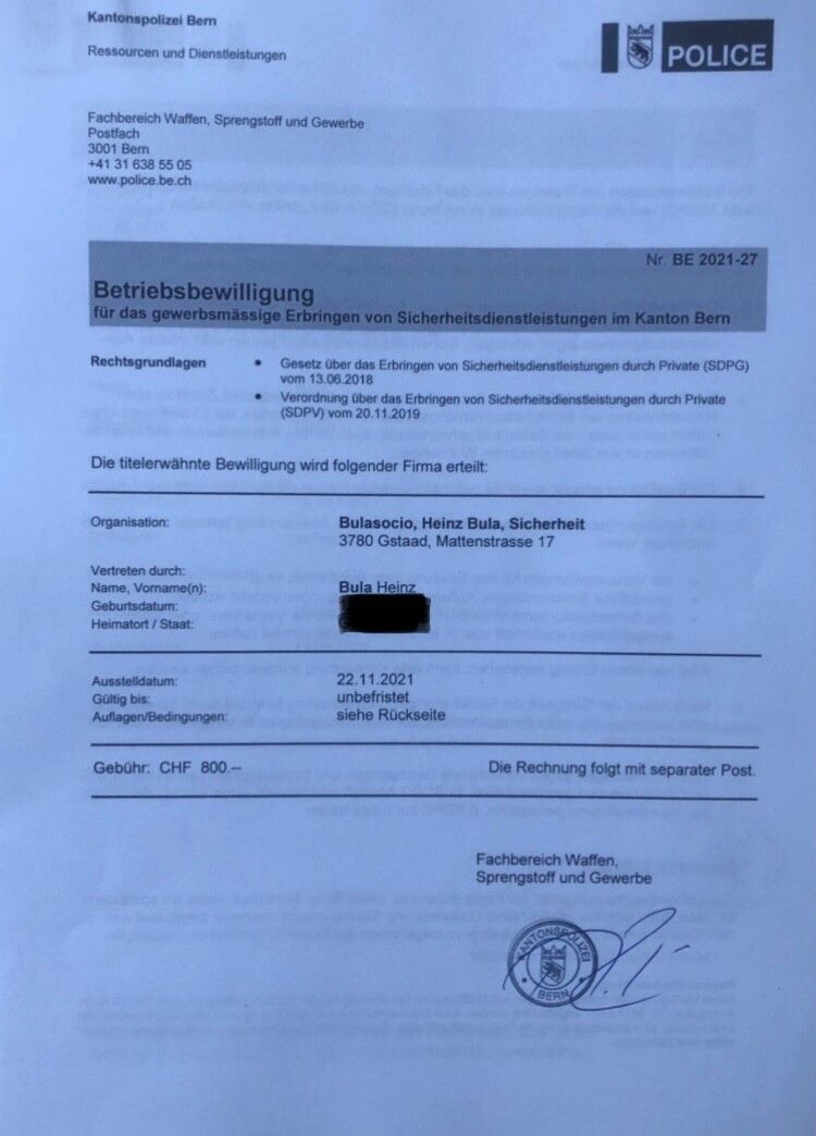 LAUTEND AUF DEN BEWILLIGUNGSNEHMER HEINZ BULA, VERTRETEN DURCH JURIST ENRICO SOCIO FÜR FIRMA BULASOCIO SICHERHEIT.