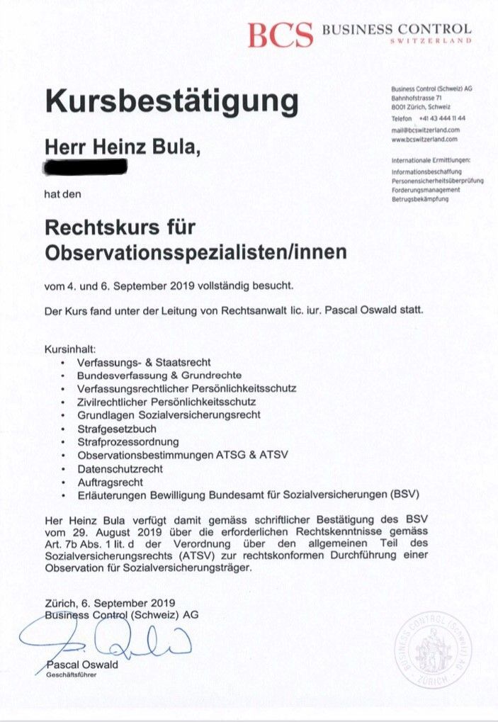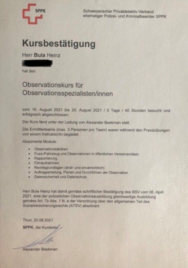 BETRIEBSBEWILLIGUNG UND DIE NOTWENDIGEN AUSBILDUNGEN FÜR SOZIALDETEKTIV GEMÄSS VORGABEN BUNDESAMT FÜR SOZIALVERSICHERUNGEN.